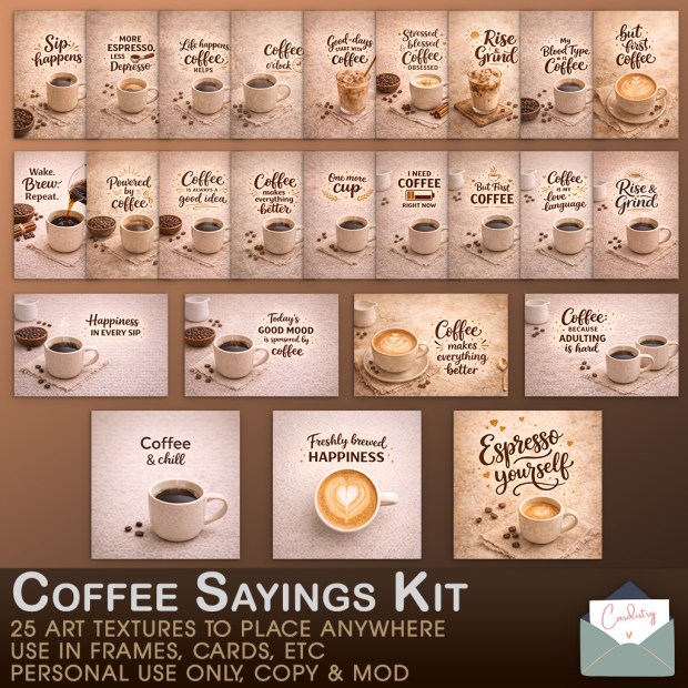 New for Cardsitry, Coffee Sayings Art Kit. Includes 25 textures to use for decor. Personal use only, mod & copy.