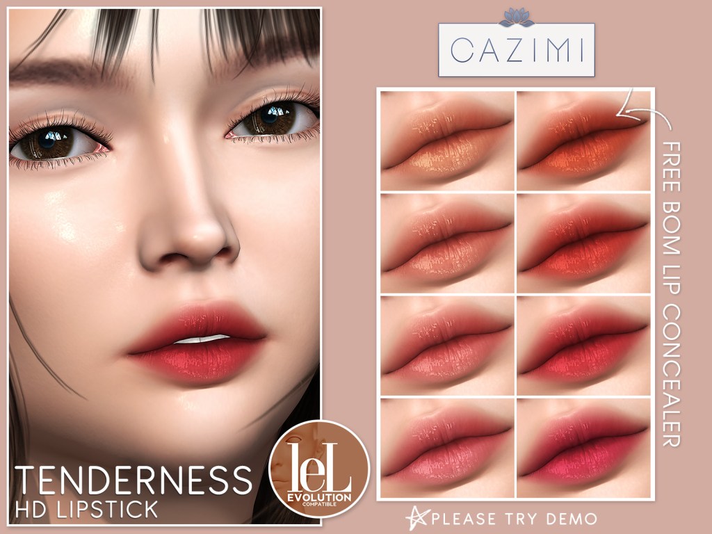NEW Tenderness HD Lips for Lelutka Evolution heads. Includes BOM lip concealer layers to help hide the skin’s lip line. Only 75L all weekend at the main store.