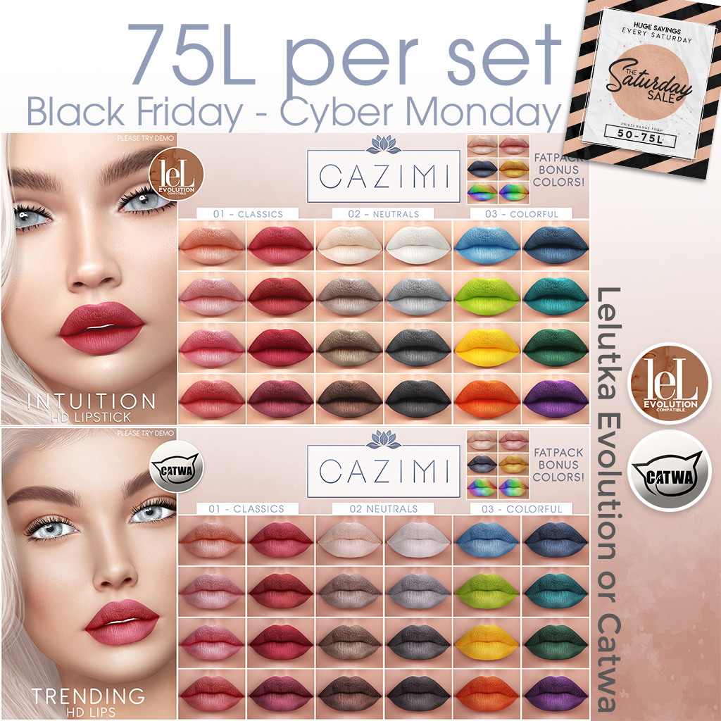 Trending HD lipstick for Lelutka Evo and Cataw HD. 75L per color pack or get all 3 packs (plus 6 bonus colors) for 200. Sale will last all weekend AND Monday for Cyber Monday.