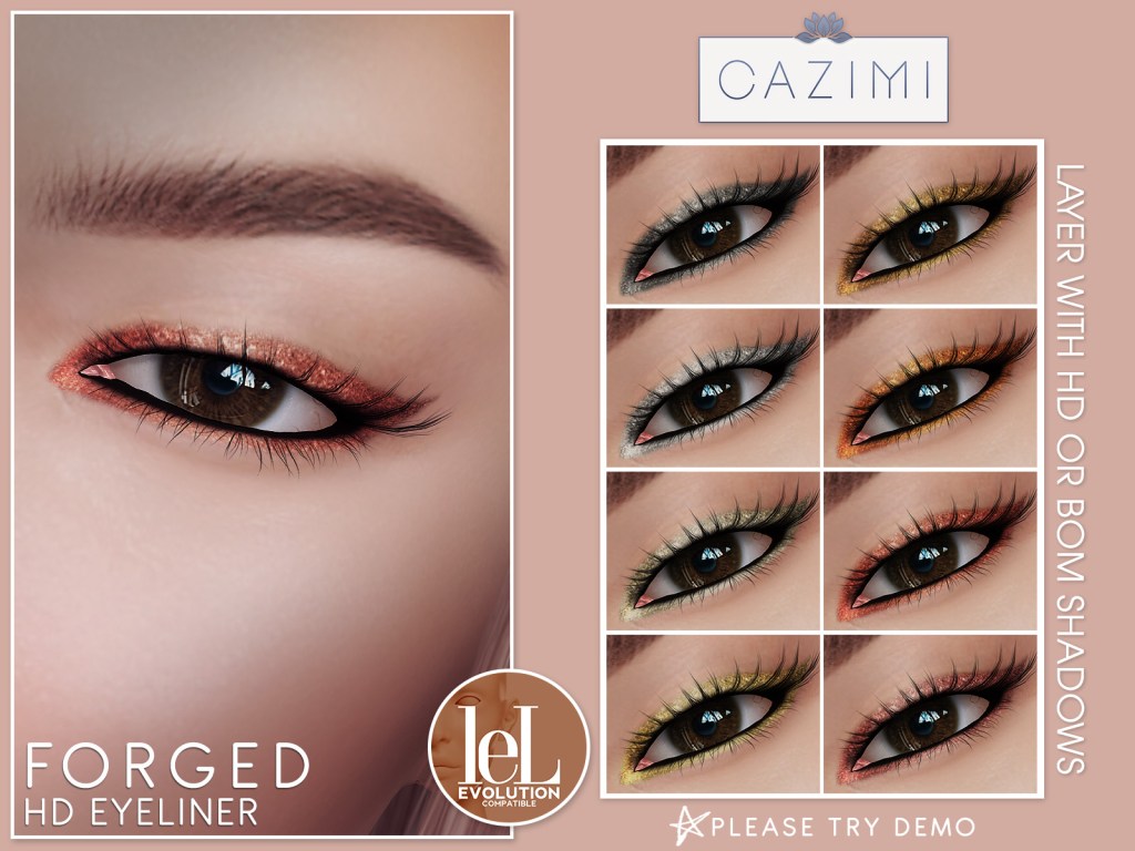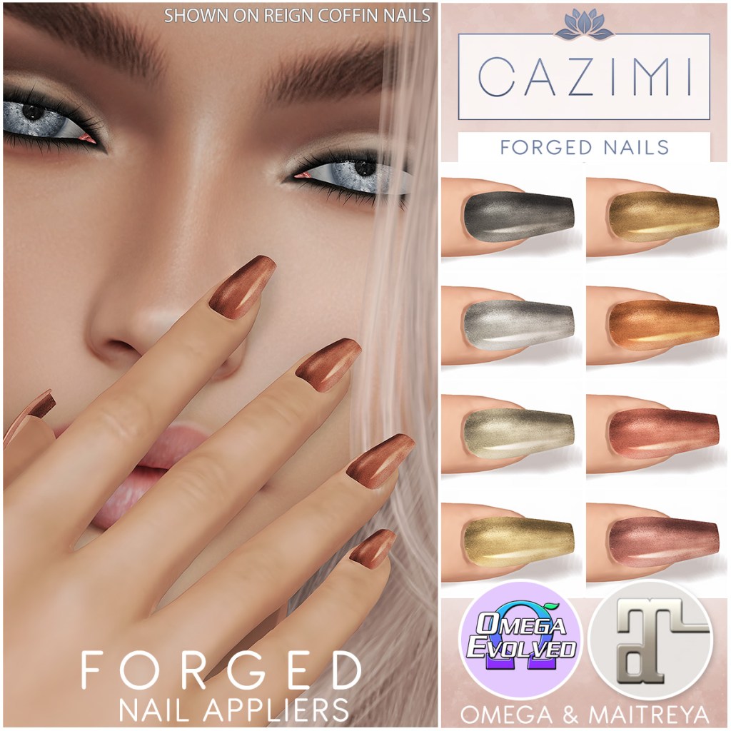 Forged HD Eyeliners for Lelutka Evolution, Forged Metallic Nail Appliers with Omega and Maitreya HUDs AND a free gift set of nails to celebrate their 10 year anniversary at Designer Showcase! Join the Designer Showcase VIP and wear you group tag before clicking the present in order to get the gift.