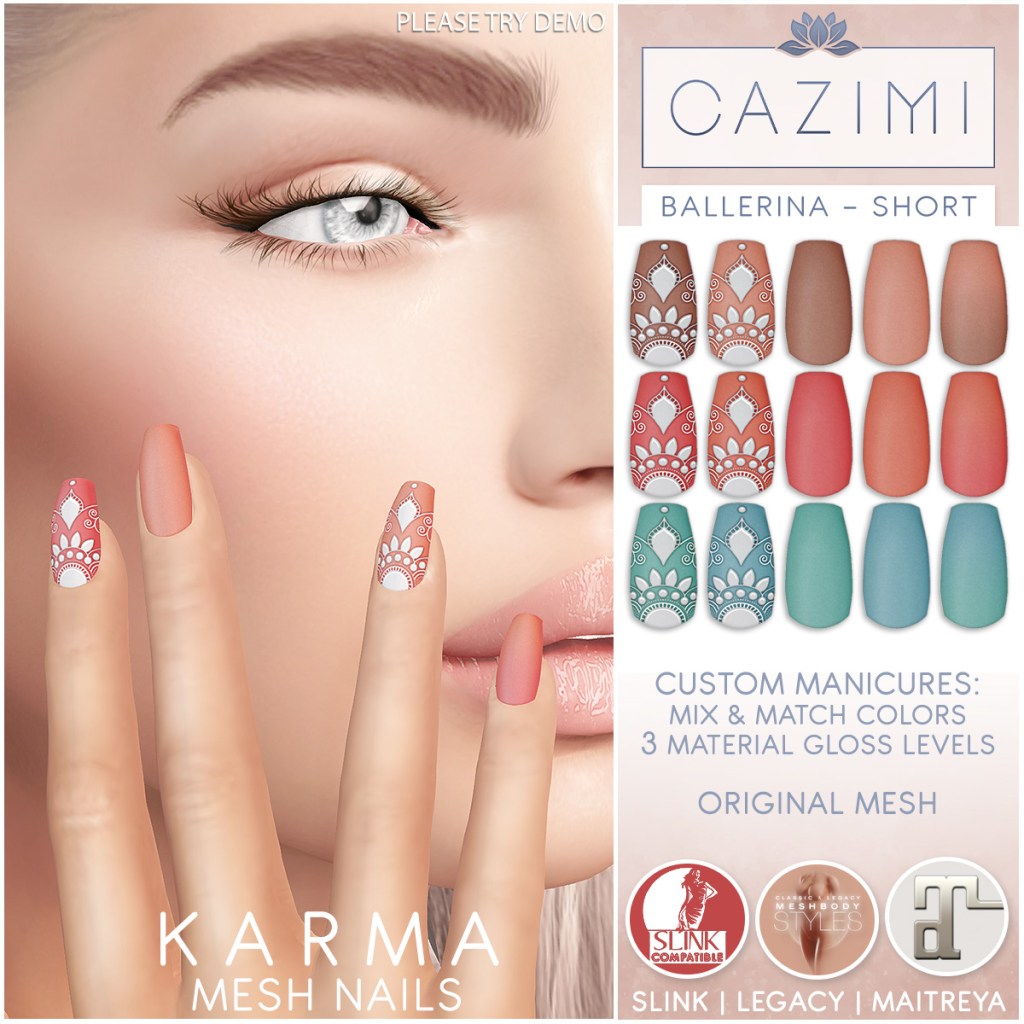 UPDATED to include support for Slink and Legacy female bodies! The Karma mesh nails are on sale all weekend for Saturday Sale at the main store.