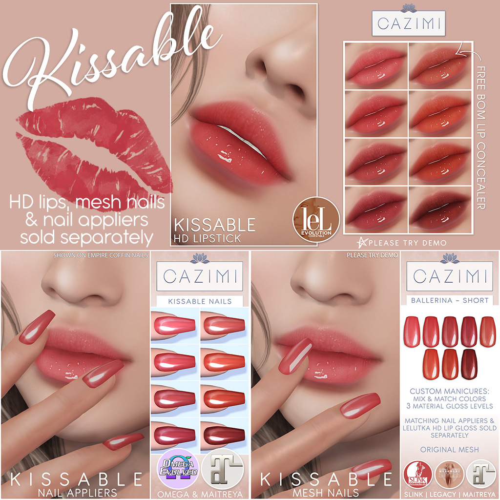Kissable HD glossy lipstick for Lelutka Evo heads, matching mesh nails (Slink, Legacy & Maitreya) and nail appliers (Omega & Maitreya). Each sold separately. Available now at TLC