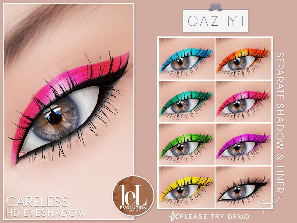 New for Saturday Sale. Careless HD eyeshadow for Lelutka Evolution heads only. Seven bright colors plus one black eyeliner. Available for 75L at the main store all weekend