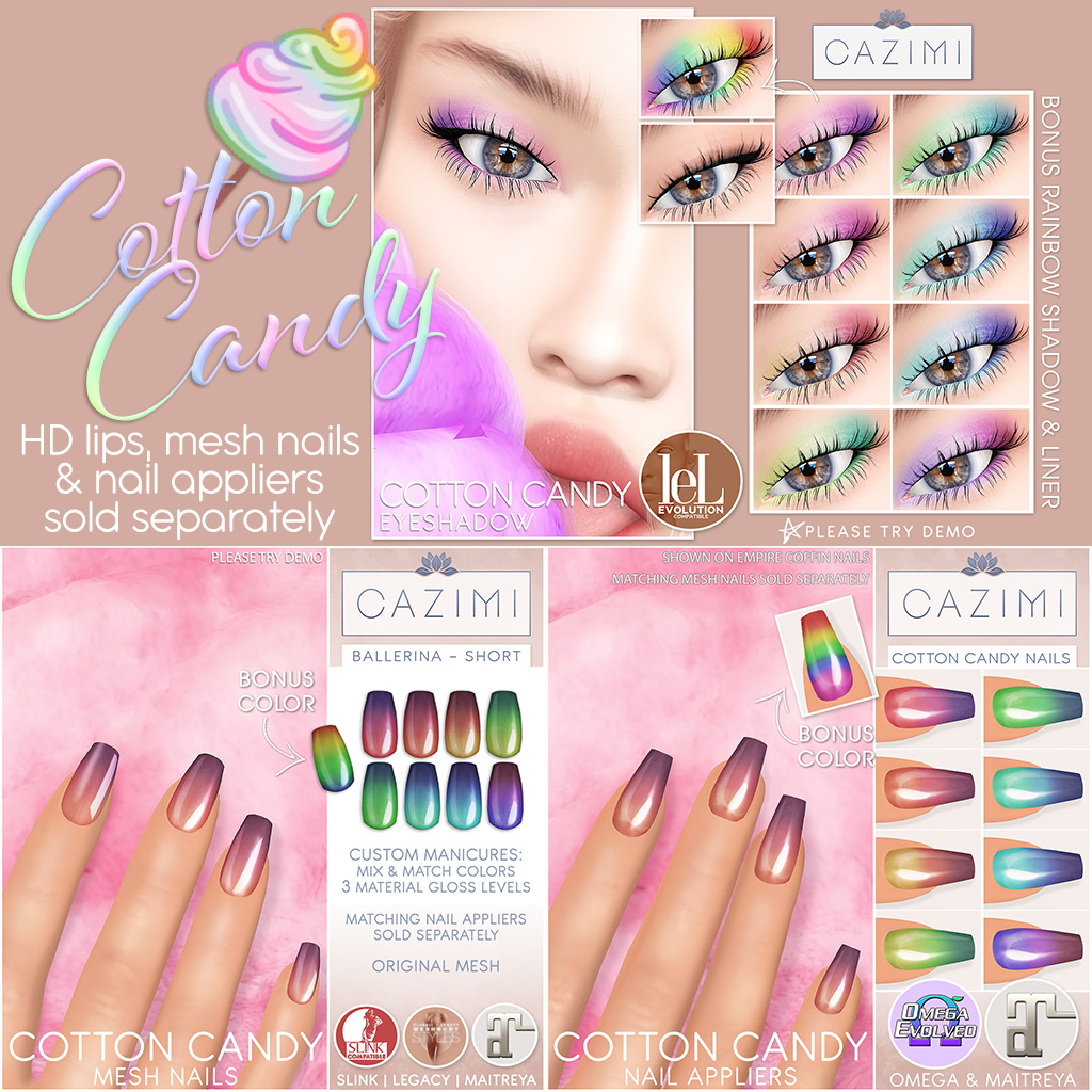 Cotton Candy colored HD eyeshadow for Lelutka Evo heads, nail appliers for Omega & Maitreya, mesh nails for Slink, Legacy and Maitreya. Available now at PRETTY