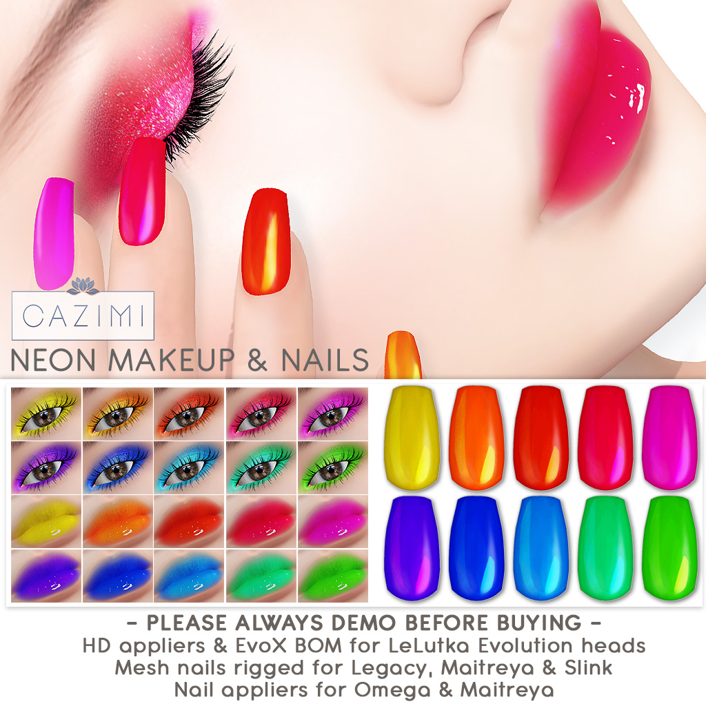 New at TLC, Neon makeup and nails. Ten bright colors for summer! HD appliers and EvoX BOM layers for Lelutka heads. Mesh nails rigged for Legacy, Slink and Maitreya. Nail appliers for Maitreya and Omega compatible nails. Please always demo makeup and mesh nails before buying!