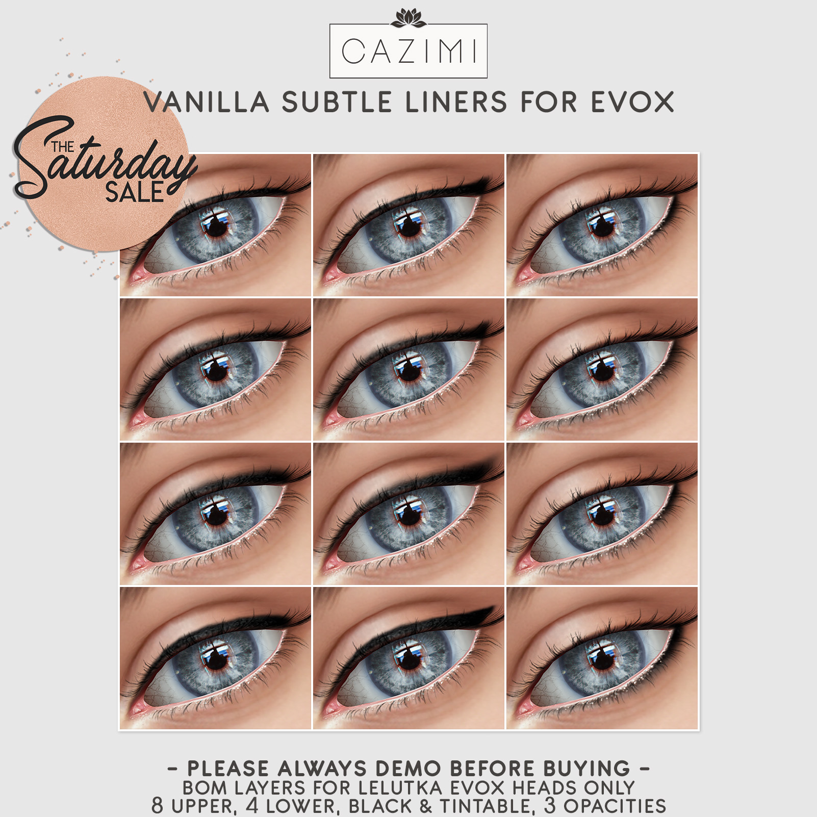 Vanilla Subtle Liners for EvoX: EvoX BOM eyeliners. Top and bottom separate. 8 top liner styles, 4 lower liner styles. Comes in black or white for tinting and 3 opacities. Only 75L this weekend