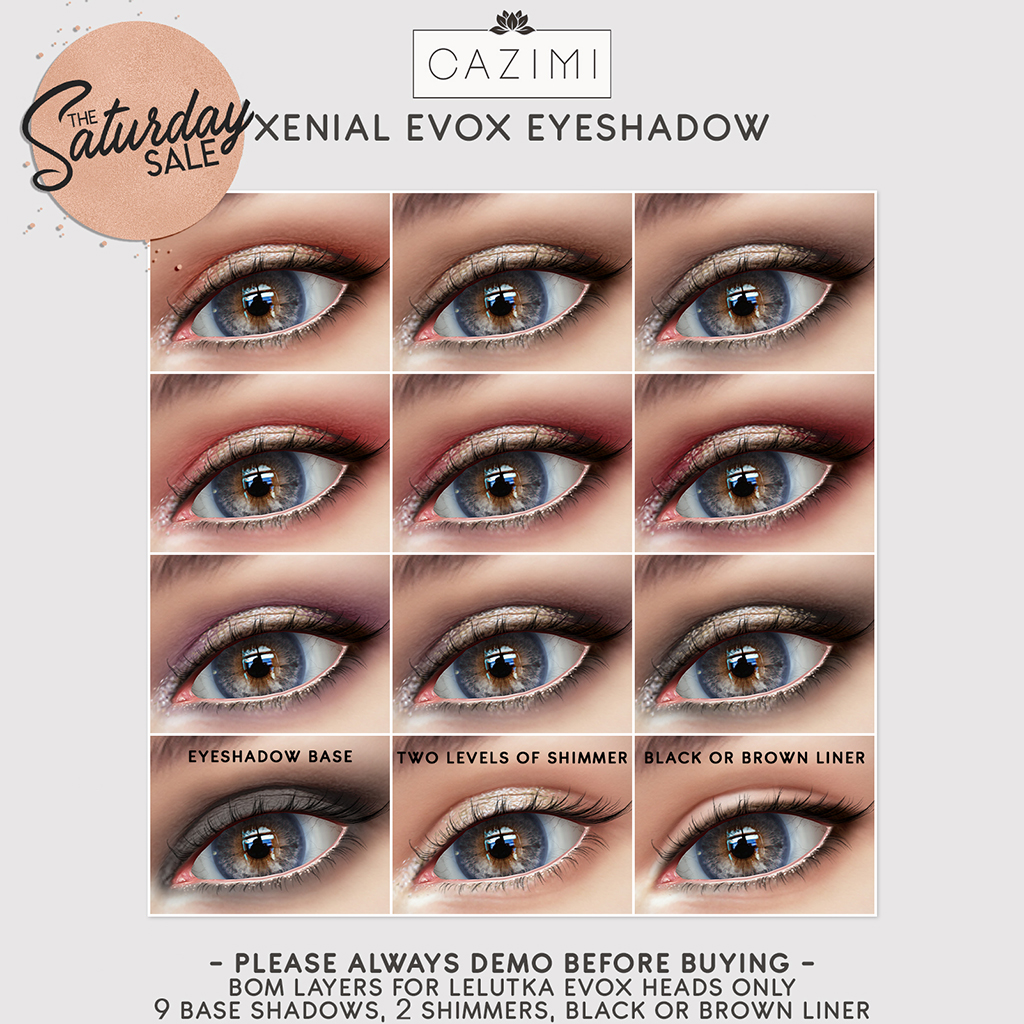 ❤ NEW for Saturday Sale this weekend, Xenial eyeshadow for Lelutka EvoX heads. 9 base shadow colors, 2 levels of shimmer and black or brown eyeliner.