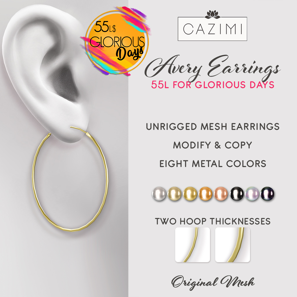 Avery Earrings: New! Unrigged mesh hoop earrings in 2 thicknesses. Comes with 8 metal textures. Mod & copy as always and original mesh ❤ 55L this weekend.