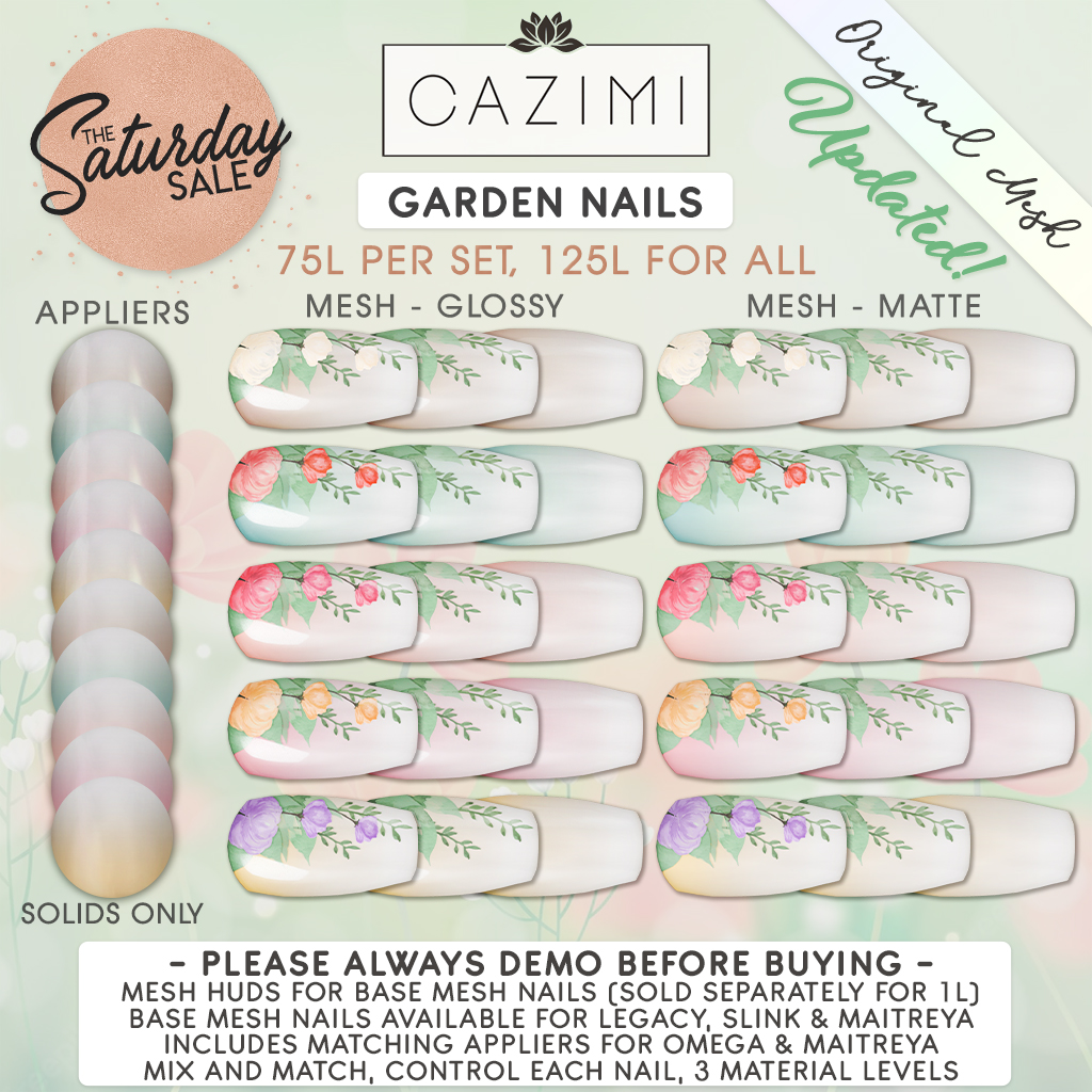 Garden Nails: Updated! Now with glossy and matte textures. Appliers include ombre pack only. 75L per pack of 15, 125 for all 30. 49L for appliers only.