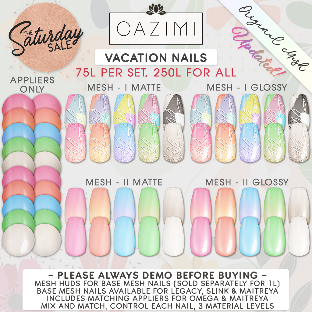 Vacation Nails: Updated! Now with coordinating appliers for Maitreya & Omega plus glossy version. 75L per set or 250 for all 4 sets. Mesh nails include the appliers, or you can buy just the appliers separately. Mesh nails require the 1L Base Mesh Nails, sold separately. Rigged for Maitreya, Legacy and Slink.