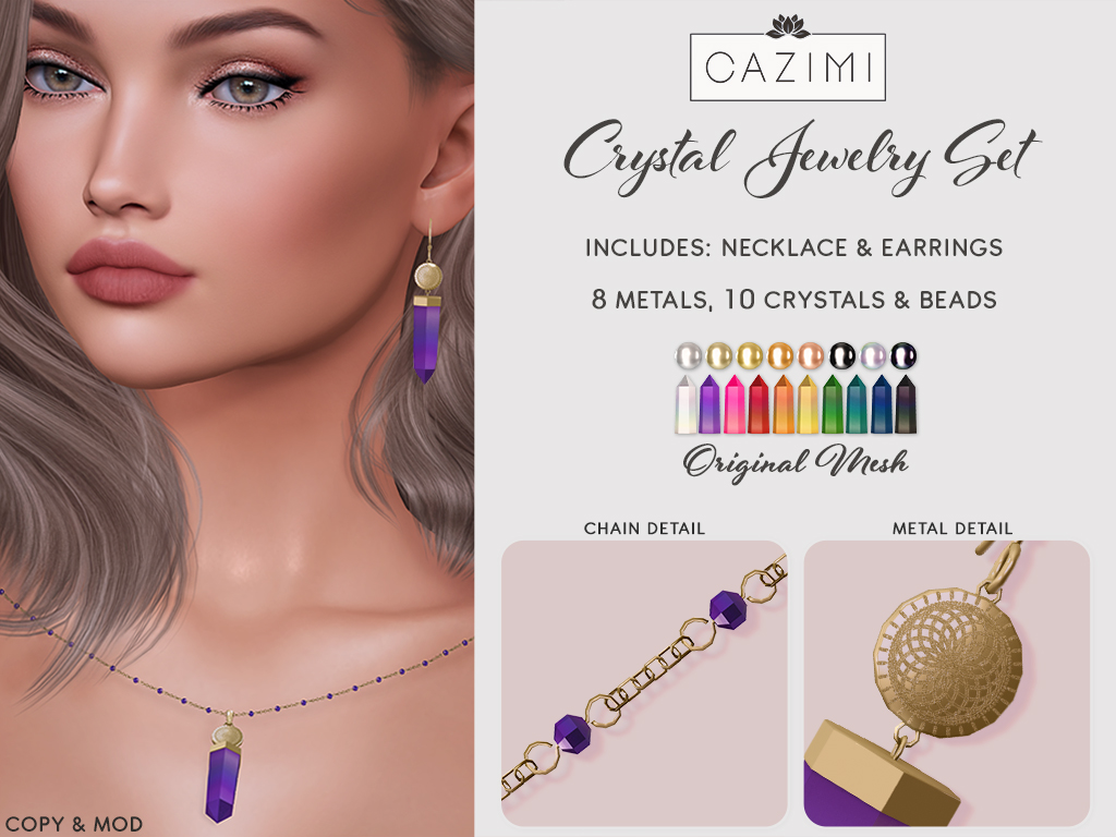 Crystal necklace and earrings set with delicate chain with stones and engraved metal detail. Eight metal colors, 10 crystal and bead colors. Modify and copy, and original mesh as always. Available at a new accessories themed event, The Vault.