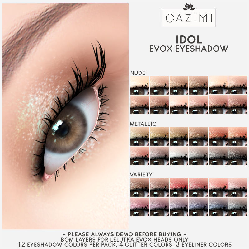 NEW for Shiny Shabby for July! Mono lid friendly shimmery eyeshadows for Lelutka EvoX heads in EvoX mode. Comes in 3 color packs each with 12 colors, 4 glitter overlay colors (silver, gold & 2 rainbows) plus eyeliner in 3 colors (black, brown and white)