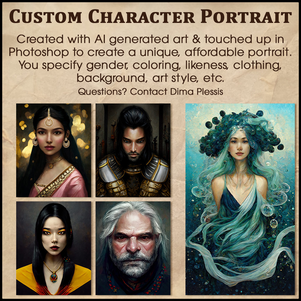 For the winner of this auction item I will create a custom character portrait! You describe what the character looks like and I use AI generated art plus Photoshop to create a portrait of them. I’ve been experimenting with this technique for weeks now and the results are beautiful!