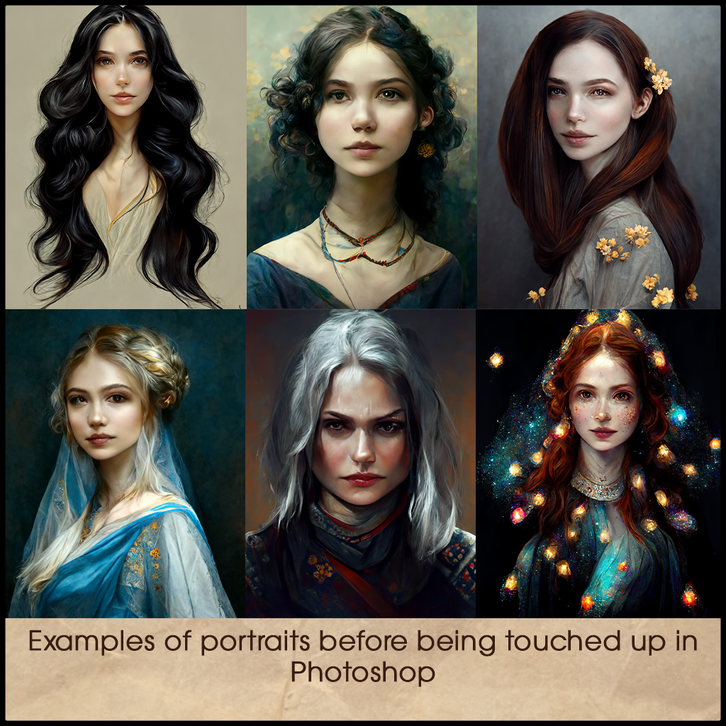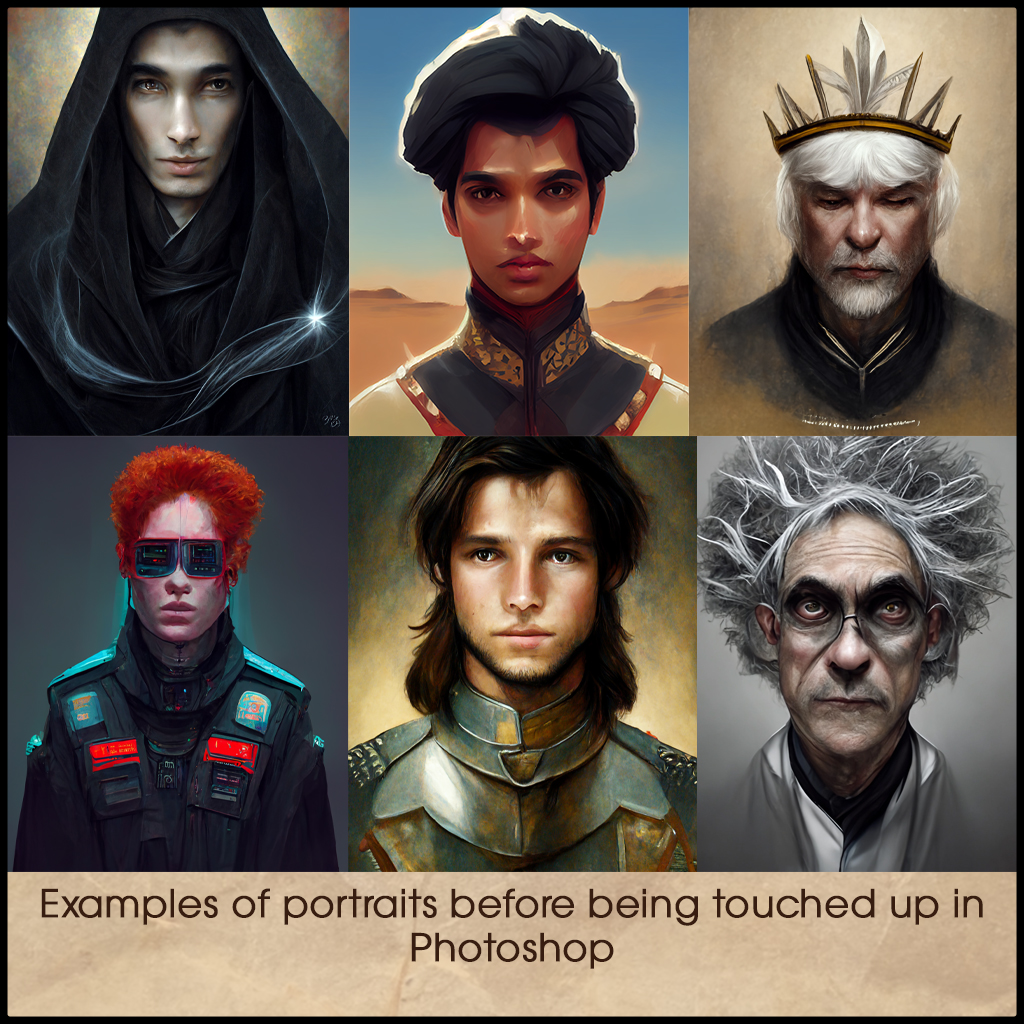 I use a text based prompt and lots of attempts to get a base image of your character using a program called Midjourney. The process to get a base image can be a few hours of trying different prompts and variations. I will pick out a few that I think are the best results out of the batch and you can choose the one you like best. The portraits are often in need of touch up from there. Things like fixing the facial features (they are often a bit off) fine-tuning the proportions, altering hair/eye/skin tone, touching up the hair, replacing the background, etc. will take another hour or two.