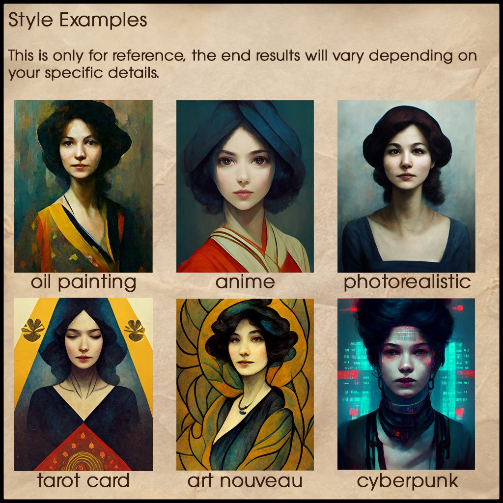 2) What art style do you want? Oil painting, manga/anime, concept art, art Nouveau, tarot card? Is it fantasy, scifi, cyberpunk, modern, etc?