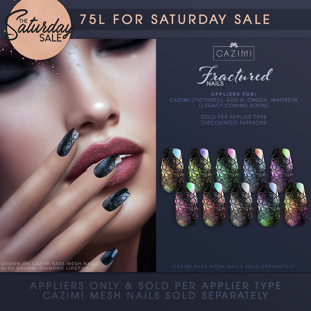 New for Saturday Sale! 75L per applier type, discounted fatpack. Appliers available for CAZIMI Base Mesh nails, Gen.X, Omega and Maitreya. Available at the new main store.
