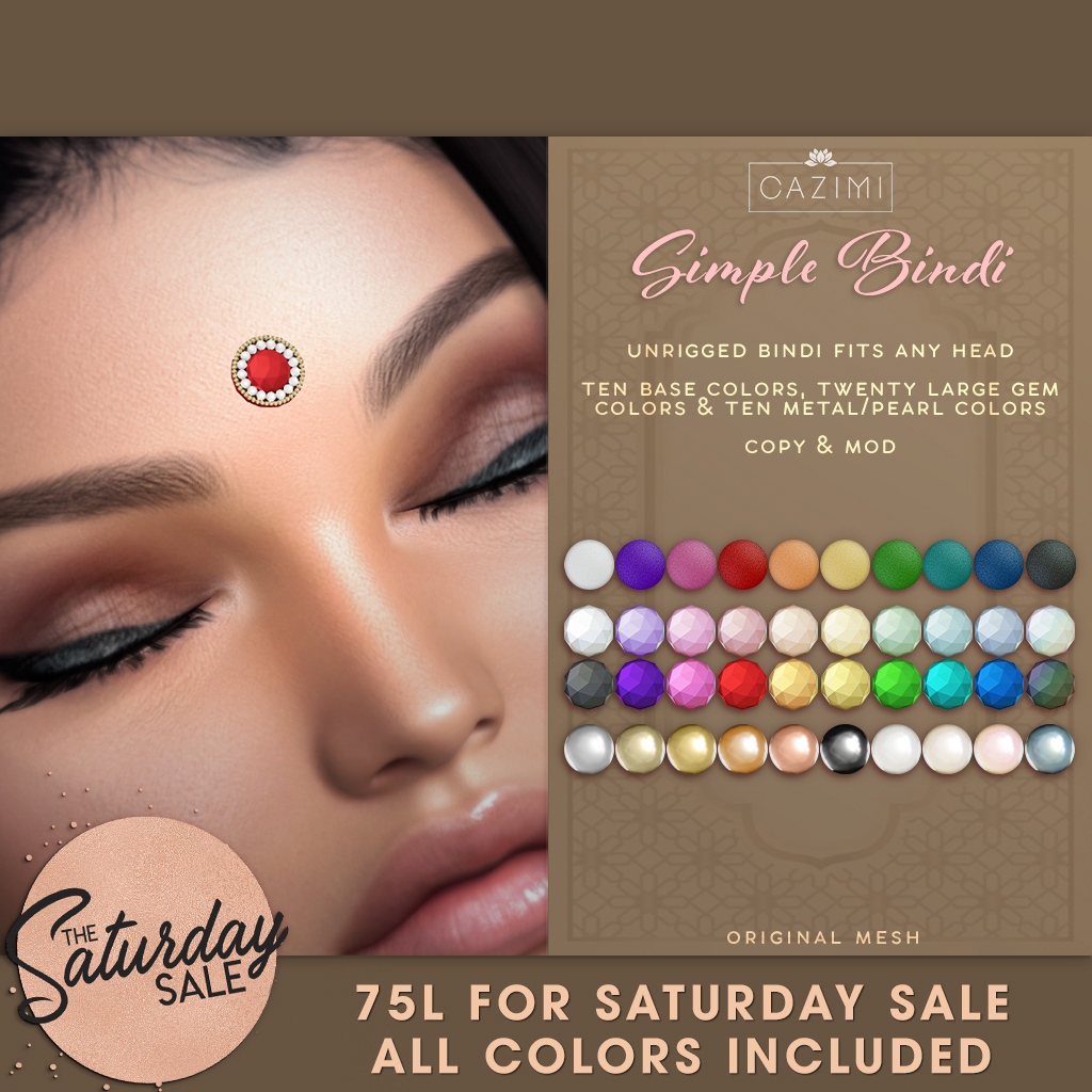 Simple Bindi: Unrigged mesh bindi with tons of color options and customization. 75L this weekend for Saturday Sale.