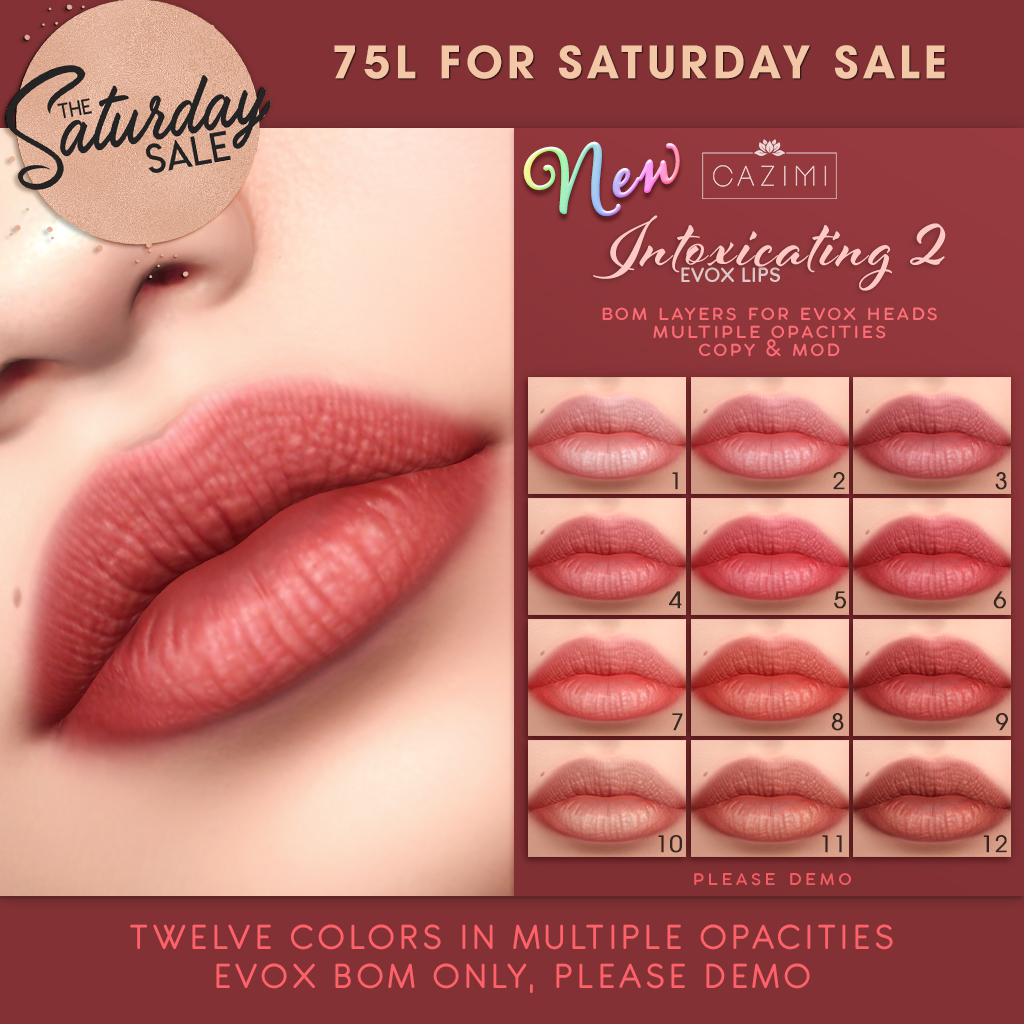 We’ve got a recolor of the Intoxicating lipstick on sale this weekend. This set is a little more saturated than the original, though still on the ‘naturals’ side for a bit more pop of color. EvoX BOM as usual. 12 colors in 3 opacities. 75L at the main store all weekend long. Enjoy!