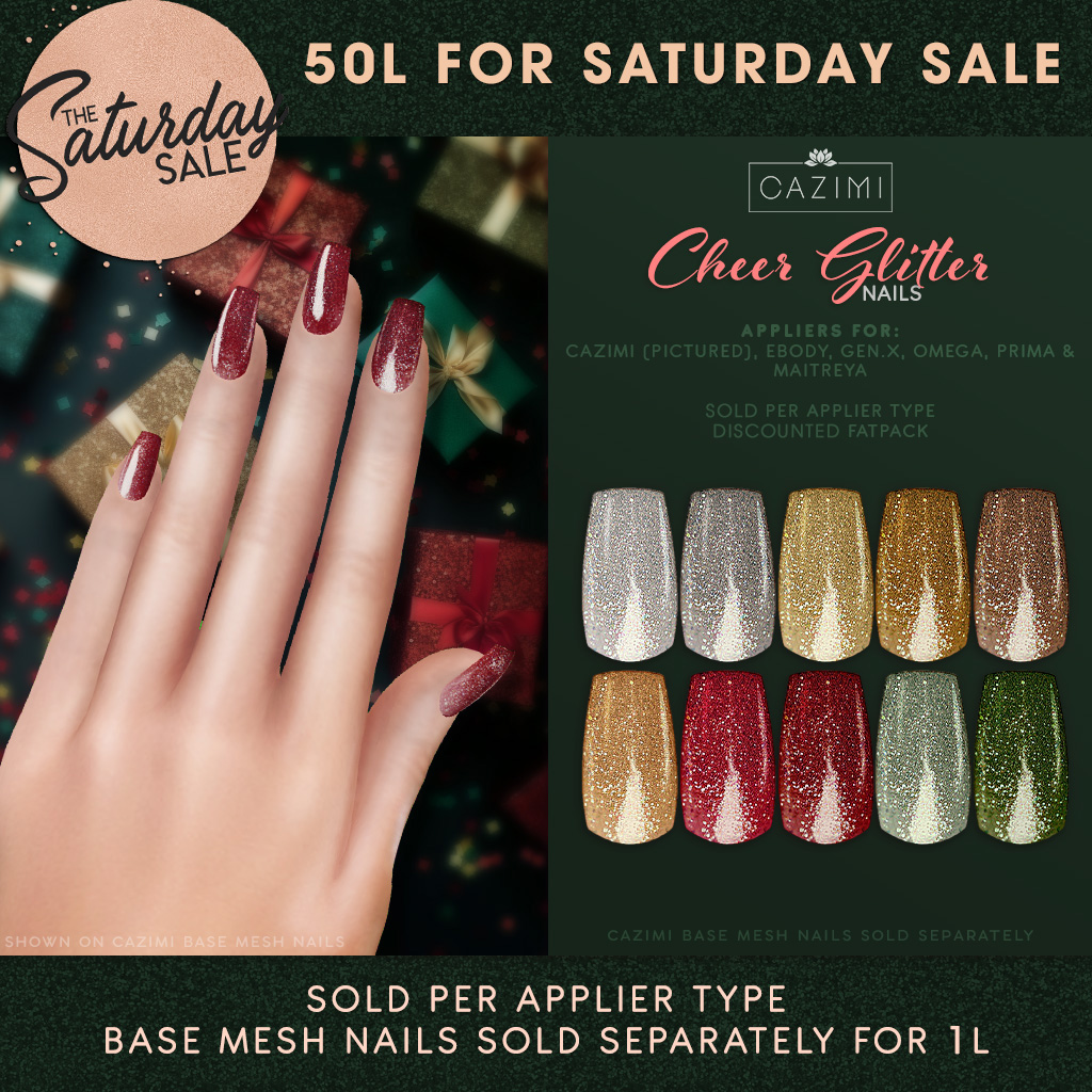 NEW for this weekend! The Cheer Glitter come in ten colors and have appliers available for CAZIMI (works on Base Mesh Nails), eBODY, Gen.X, Omega, Prima and Maitreya. If you’re buying more than 2 packs grab the fatpack and save a little more! Available at the store all weekend.