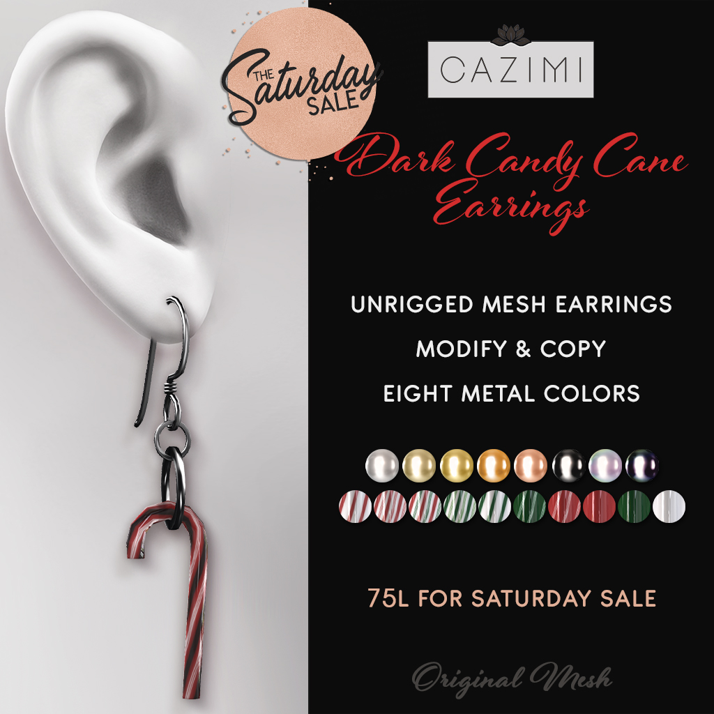Dark Candy Cane Earrings: Recolor! These candy cane earrings come in the same dark candy colors as the Dark Candy Cane Hairsticks. Unrigged, copy & mod. Includes 8 metal colors and ten candy colors.