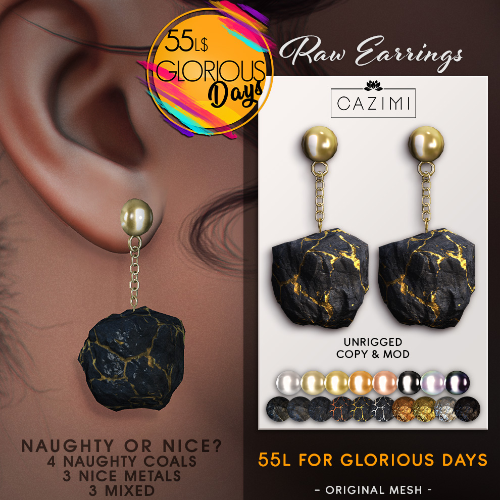 Raw Earrings: NEW! Have you been naughty or nice? Maybe something in between? The Raw Earrings have a nugget of coal, metal, or raw ore for something in between. 4 coal textures, 3 raw metals and 3 ore vein rocks. Includes 8 jewelry metals as well. Unrigged, copy & mod. Just 55L this weekend for Glorious Days.