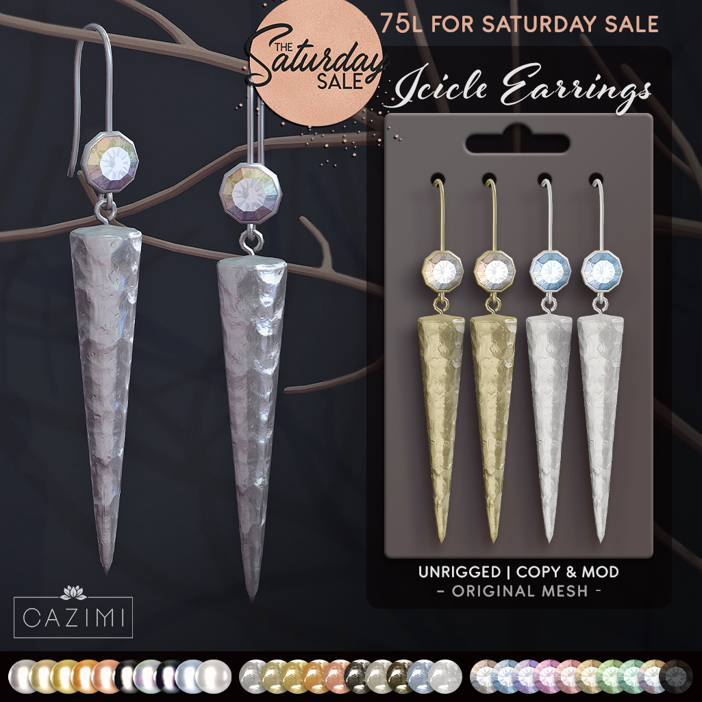 The Icicle Earrings come with 10 metal colors, 10 ‘ice’ colors and 10 gemstones. Unrigged, copy & mod. 75L for Saturday Sale.