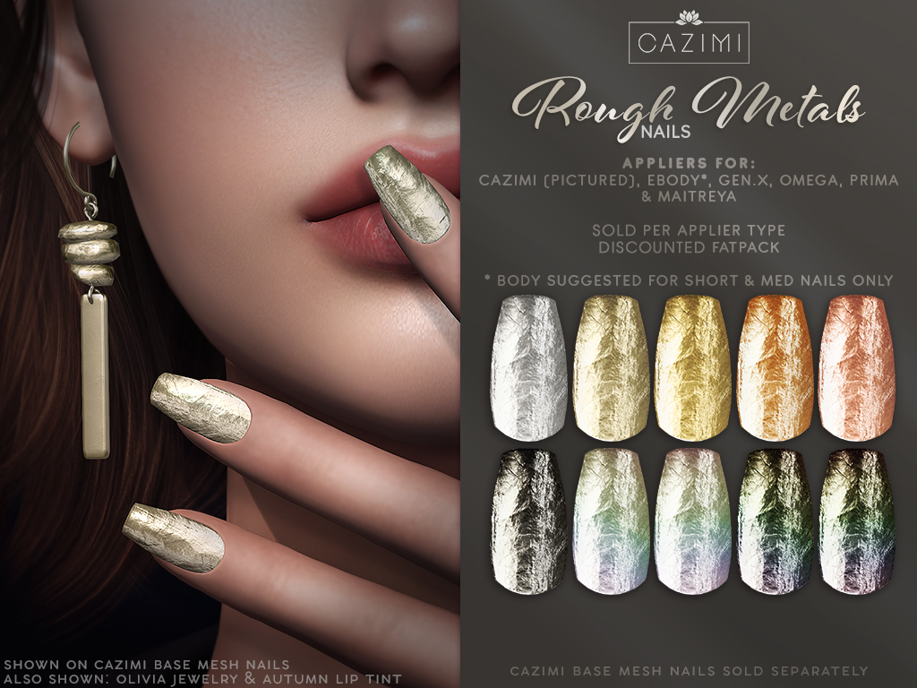 NEW at N21! Olivia jewelry set comes with 8 metals, 14 raw gemstones and 8 raw metals. Jewelry is unrigged, mod and copy. The Rough Metals nails match the metals in the Olivia jewelry with 10 metallic colors. Appliers available for CAZIMI, eBODY*, Gen.X, Omega, Prima and Maitreya. Sold per applier type.