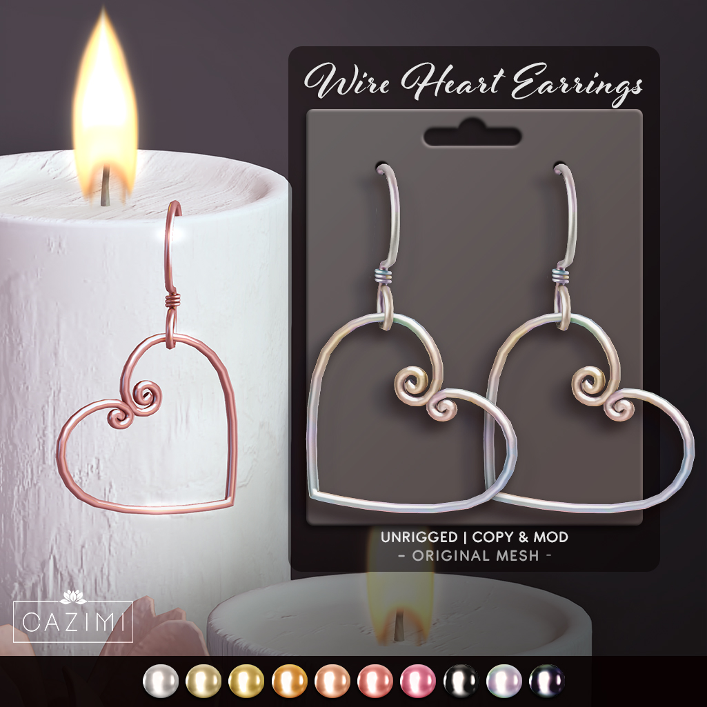 NEW at Designer Showcase, the Anna Earrings and Bracelets! Unrigged original mesh. They come with either gemstones or pearls in 16 colors and with 8 metal colors. Bracelets include single or triple. Also, to celebrate this 13th anniversary round, we’ve made these cute Wire Heart Earrings as a gift! Make sure to wear your Designer Showcase tag to get the gift. All are available at Designer Showcase.