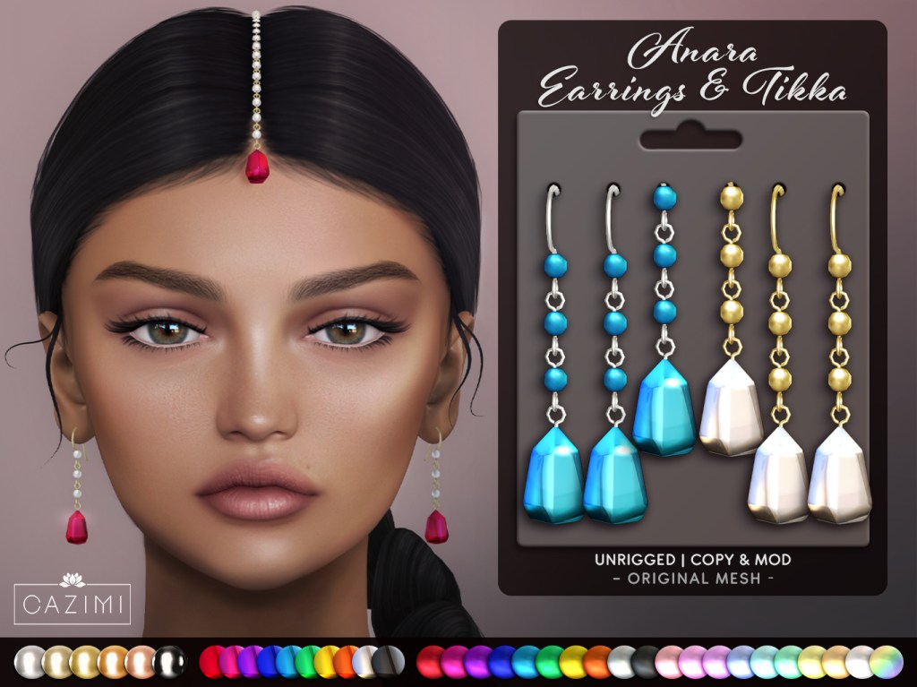 NEW Anara Earrings & Tikka jewelry set just 75L for Saturday Sale this weekend. Jewelry is unrigged, mod and copy with 6 metals, 10 stones and 20 pearl colors. Available at the main store all weekend long.