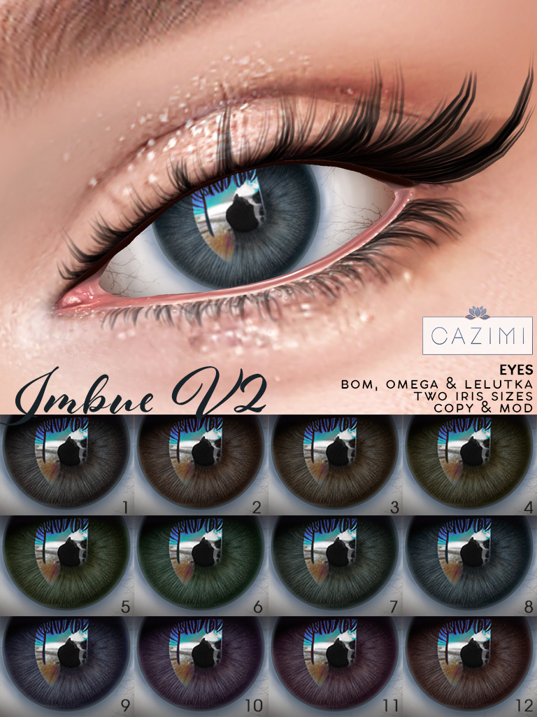 Imbue eyes come in 12 colors with 2 iris sizes. Version 1 has more variation while version 2 is a more even color over the iris area. Comes with Omega & Lelutka Evolution appliers as well as BOM system eyes. Available at the new round of Flourish.