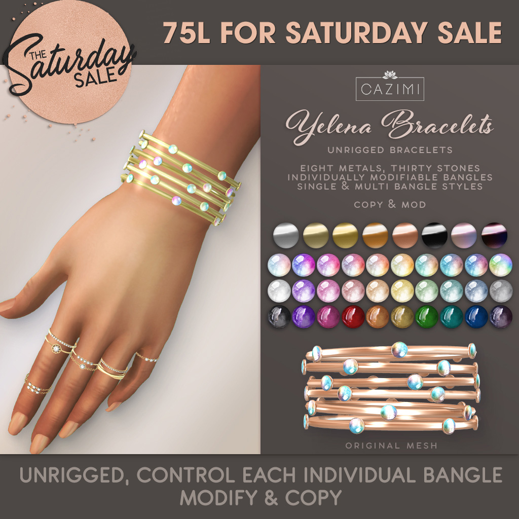 Yelena bangles also 75L for Saturday Sale this weekend. Eight metal colors and thirty stone colors. Mod & copy.