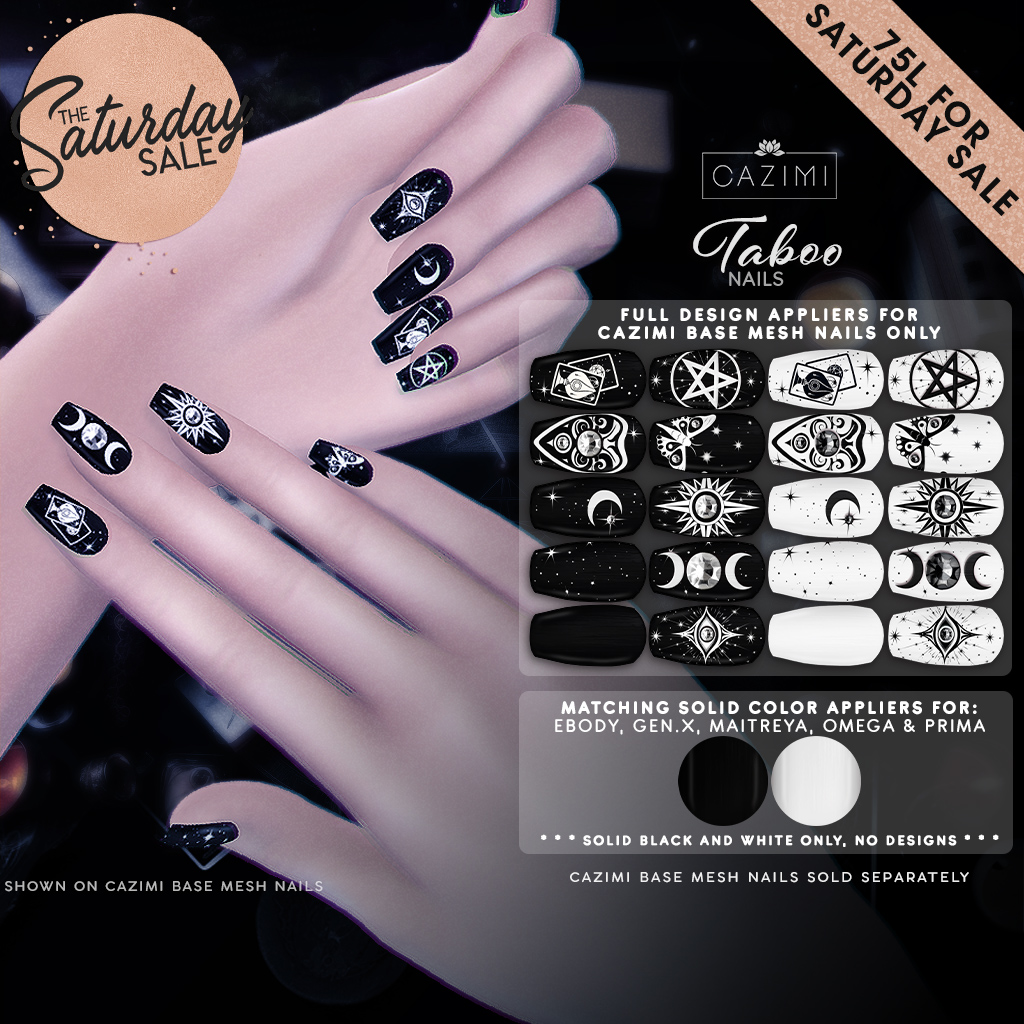 Taboo Nails come with 20 nails for CAZIMI Base Mesh Nails. Solid only black and white appliers for eBODY, Gen.X, Maitreya, Omega and (new!) Prima so you can have matching toes. 75L for all.