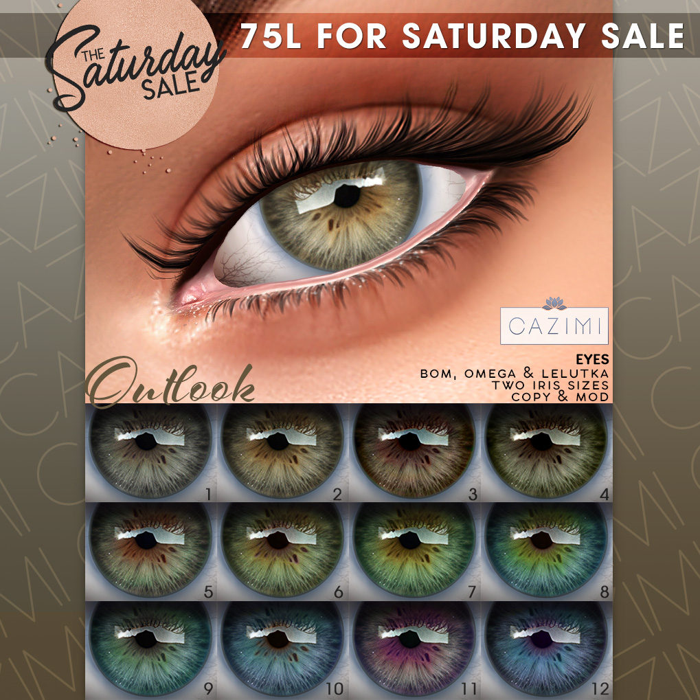 NEW Outlook Eyes 75L for Saturday Sale. BOM, Omega and Lelutka Evolution compatible. Comes in 12 colors with two different iris sizes.