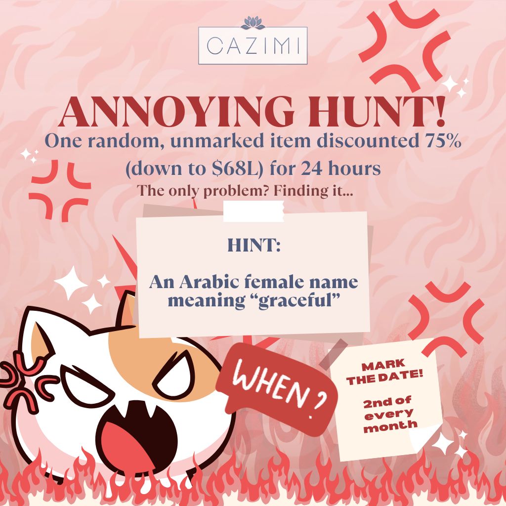 All day December 2nd, CAZIMI is doing the Annoying Hunt! One random unmarked item has its fatpack discounted 75% (down to $68L) for 24 hours. The only problem is… finding it!