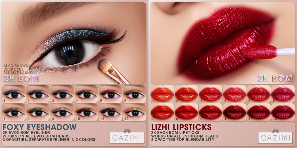 NEW for Designer Showcase, Foxy and Lizhi 2K EvoX BOM makeup. Both come with 12 colors and 3 opacities. Foxy Eyeshadow also has a separate eyeliner in 2 colors. Available at Designer Showcase.