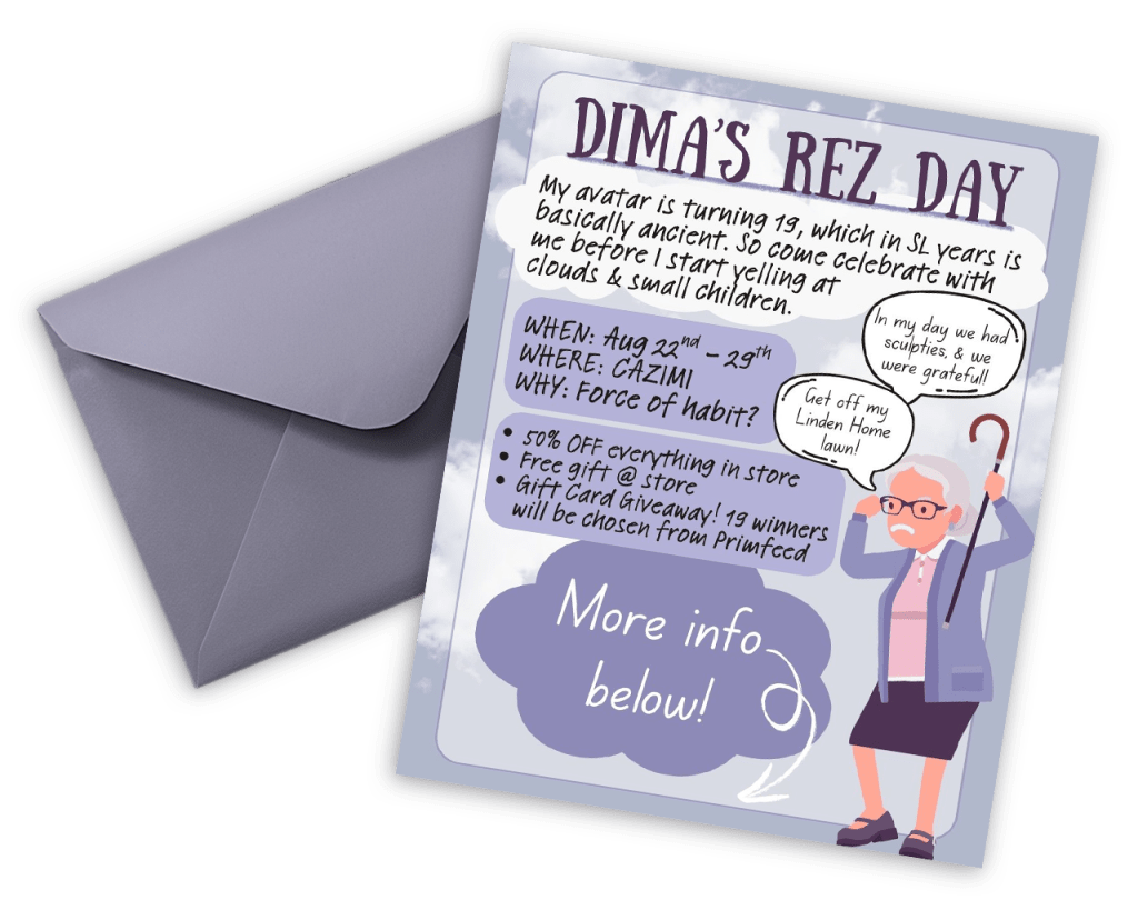 My yearly rez day bash is fast approaching! This year I will give away a gift card for every year I’ve been in SL, 19 in total! I am starting entries now, and will announce winners on my rez day. That way you can use your gift cards during the big 50% sale! The sale will be from August 22nd – 29th so you get a whole week to shop. I will also have a new gifty available in the store.