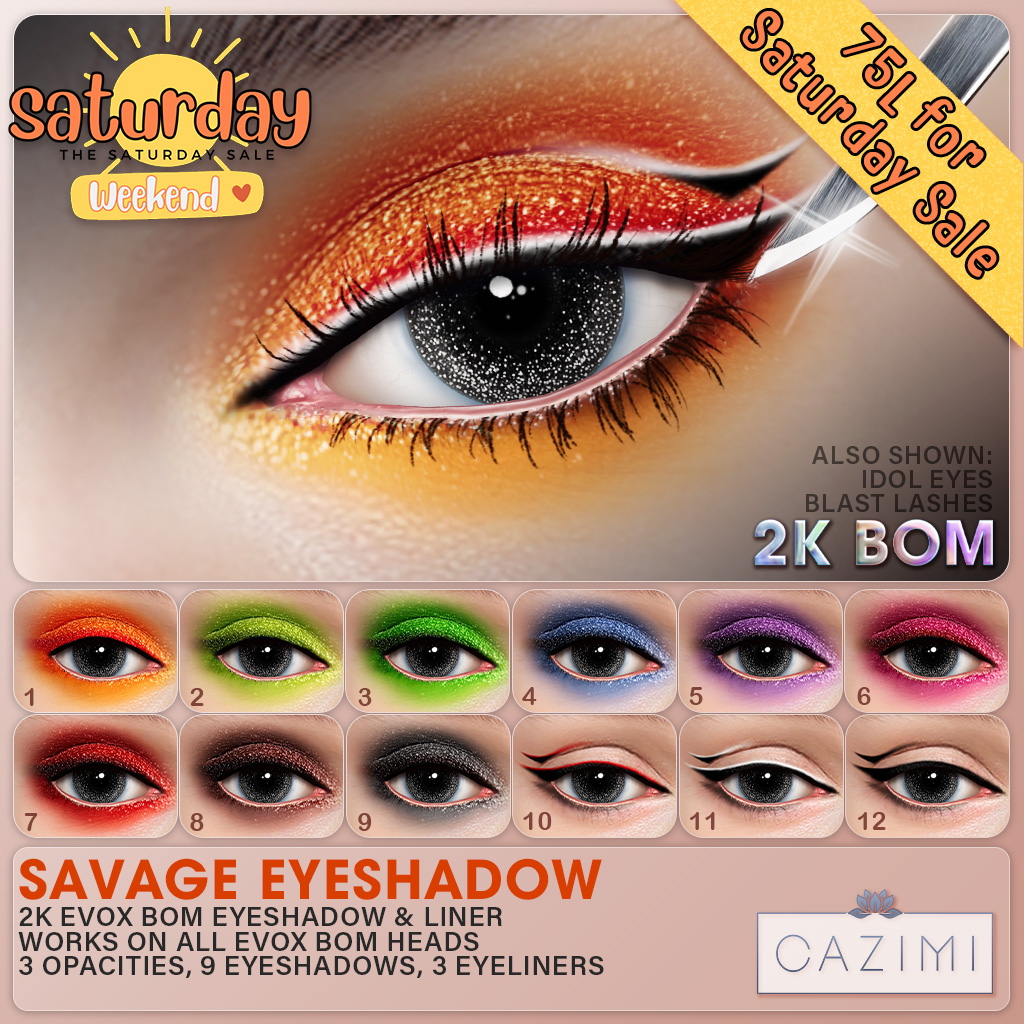 The Savage eyeshadow and lips are 2k EvoX BOM. Each comes in 9 base colors and 3 liners/overlays. each is 75L all weekend long at the main store.