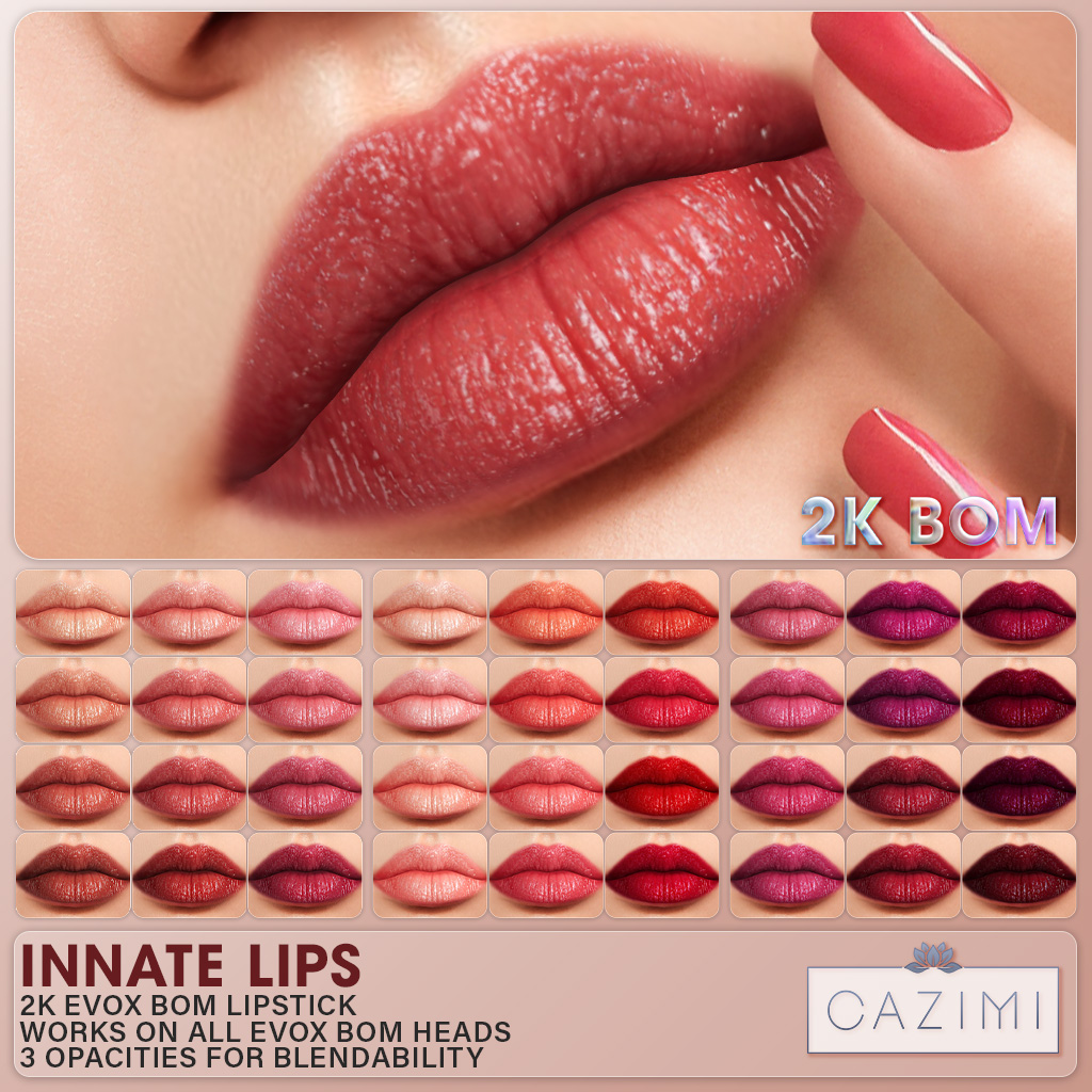 NEW Innate 2k EvoX BOM Lips at Designer Showcase. Available in 36 colors and 3 opacities for blendability.