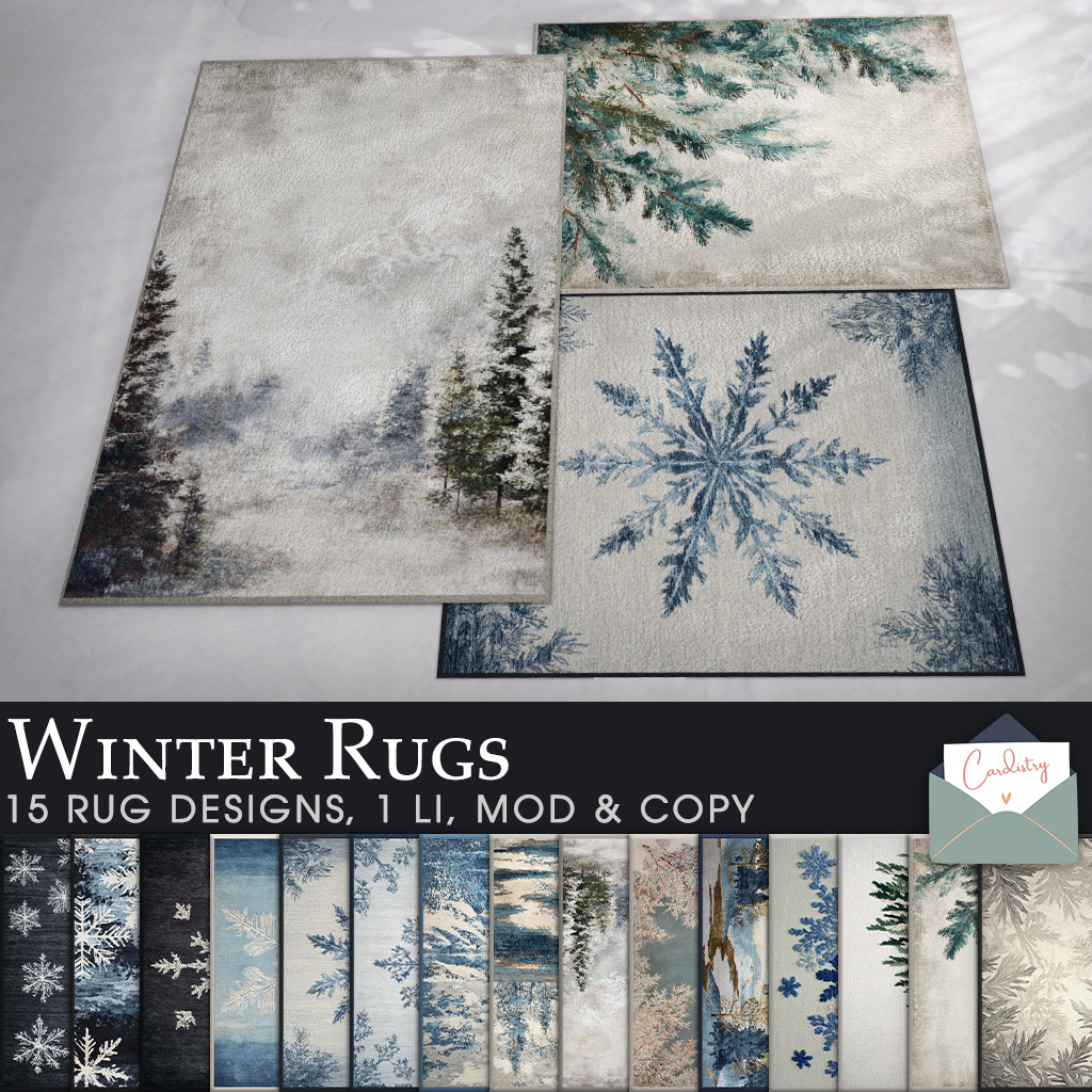 New for Cardistry at Designer Showcase, the Winter Rugs! 15 rug designs, 1 land impact and mod & copy.