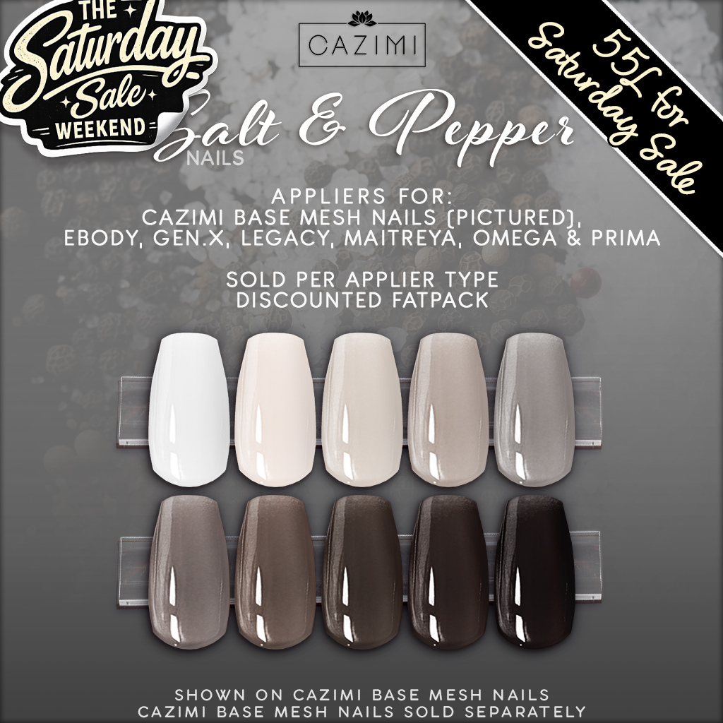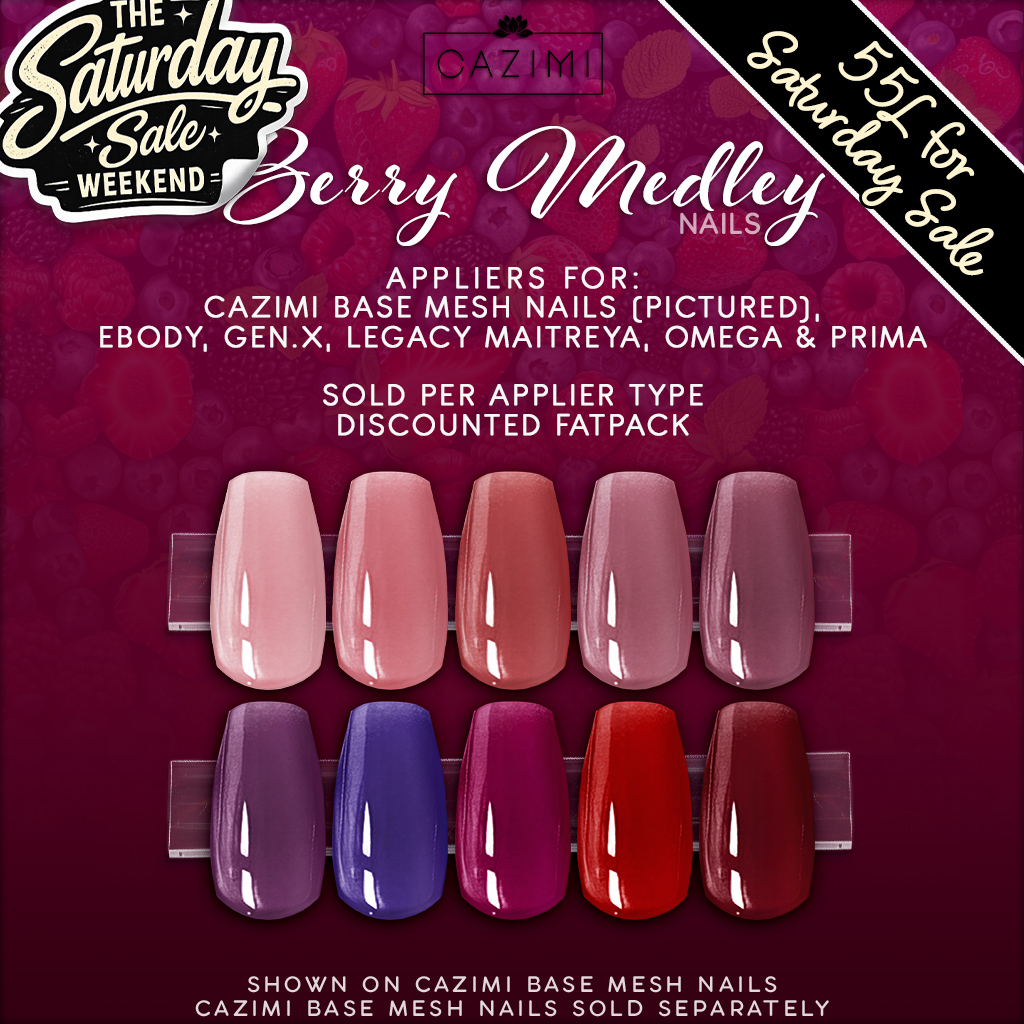 Updated for Saturday Sale, now with Legacy appliers! Berry Medley and Salt and Pepper are available at the main store. Solder per applier type and available for CAZIMI Base Mesh Nails, eBODY, Gen.X, Legacy, Maitreya, Omega & Prima.