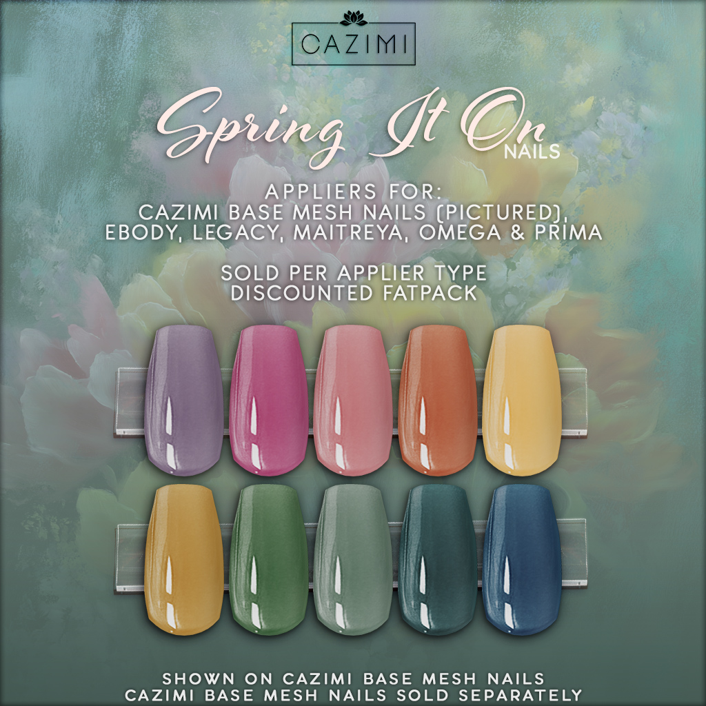 NEW at Designer Showcase! Spring It On Nails with appliers for CAZIMI Base Mesh Nails, eBODY, Legacy, Maitreya, Omega and Prima. Sold per applier type.