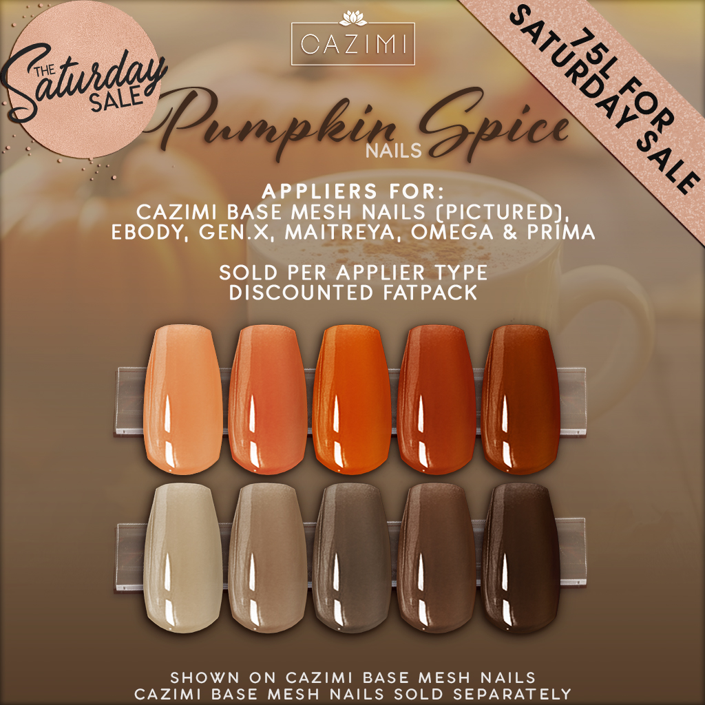 Spookzilla 2023 Nails are my nails from last year’s Spookzilla Hunt. They came in 30 different designs for the CAZIMI Base Mesh Nails only. Matching SOLID ONLY (no designs) appliers for eBODY, Gen.X, Omega and Maitreya.