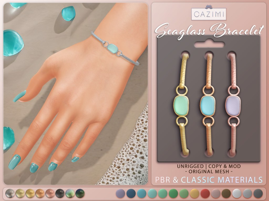 NEW at REDEUX, this delicate seaglass mesh bracelet features a smooth piece of seaglass, perfect for a touch of ocean charm. Fully mod and copy, unrigged, with 8 metal finishes and 14 seaglass colors to mix and match. Only 99L at REDEUX, along with several other items priced 50L – 75L.