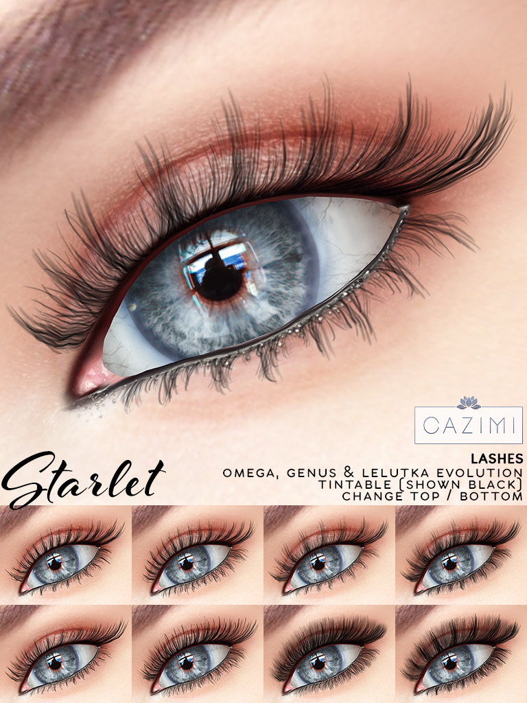 Also the Blast and Starlet lashes are 50%. They come with Omega, Genus and Lelutka Evolution appliers. Each has 8 lash options and the ability to change top or bottom lashes separately.