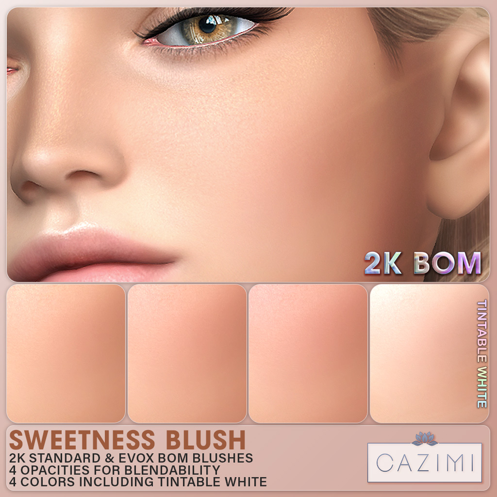 We’ve updated the Sunshine Bronzer with 2K textures. It has both EvoX and standard UV layers in 4 opacities and 4 colors, including a tintable white. 50% off at The Outlet only!