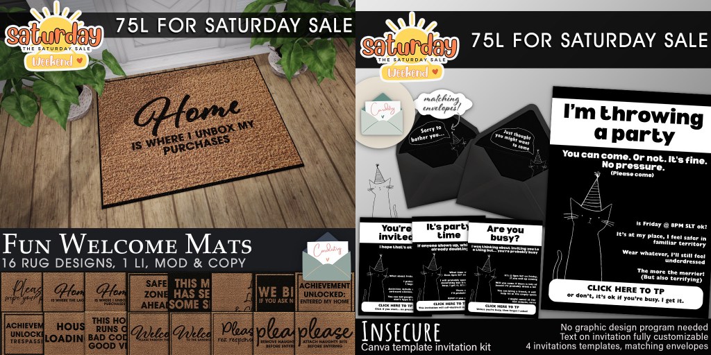 The Insecure Invitation Kit is made for the socially anxious party planner. Uses Canva to be fully customizable and only requires a free account. No graphic design program needed. Comes with 2 fun matching envelopes and a wearable HUD to configure to give as invitations to your guests. Buy it now! Or don’t? Either is fine, I won’t check my sales obsessively. Probably.