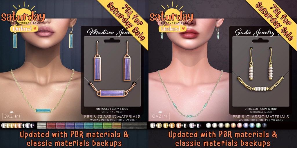 Updated for this weekend’s Saturday Sale. Now with PBR materials. Madison and Sadie Jewelry set are mod and copy, just 75L all weekend at the main store.