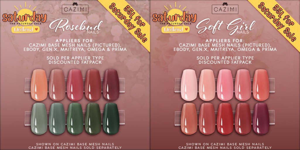 NEW for Saturday Sale, two different styles of french nails. 75L per applier pack. Available for CAZIMI Base Mesh Nails, eBODY, Gen.X, Maitreya, Omega and Prima. Available at the main store