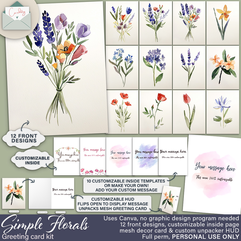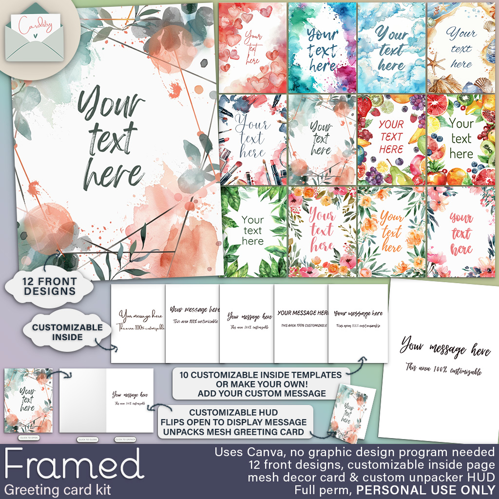 Greeting card kit for person use. 12 designs for card front, 10 customizable card inside templates using Canva (free!). Framed version also comes with templates for the front to add your own text for any occasion. No graphic design program needed. Includes greeting card style unpacker and mesh greeting card to gift to your recipient. Available at Designer Showcase!