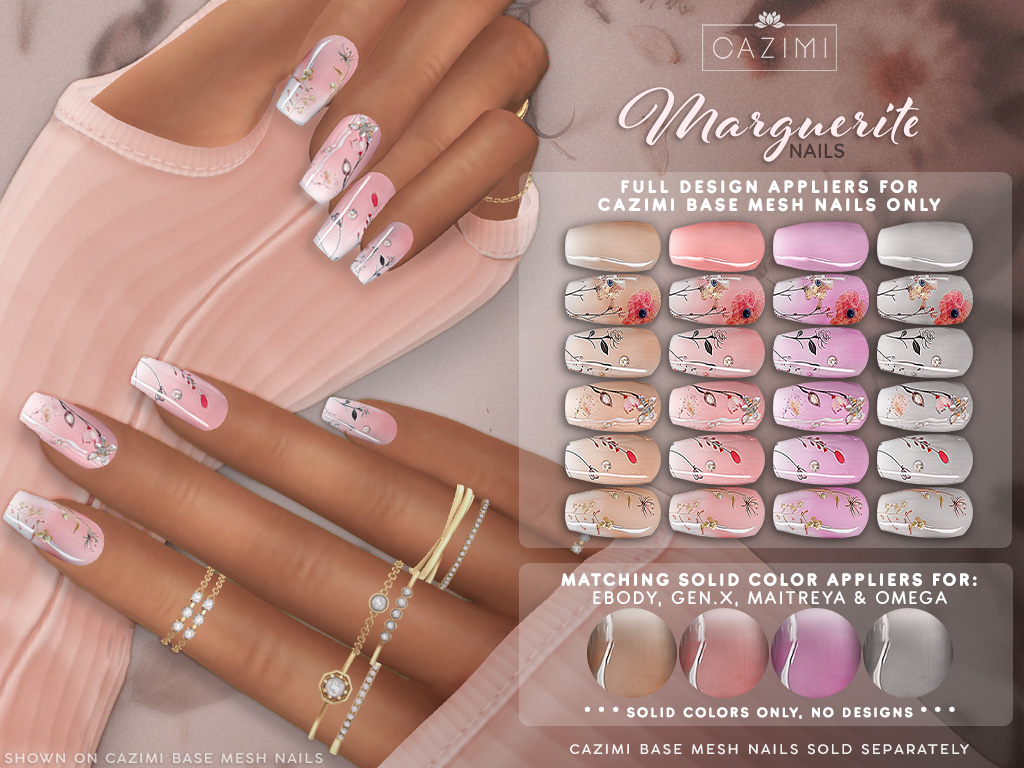 New Marguerite Nails for Designer Showcase! Full designs available for CAZIMI Base Mesh Nails only. Solid design coordinating appliers for eBODY, Gen.X, Maitreya, Omega & Prima.